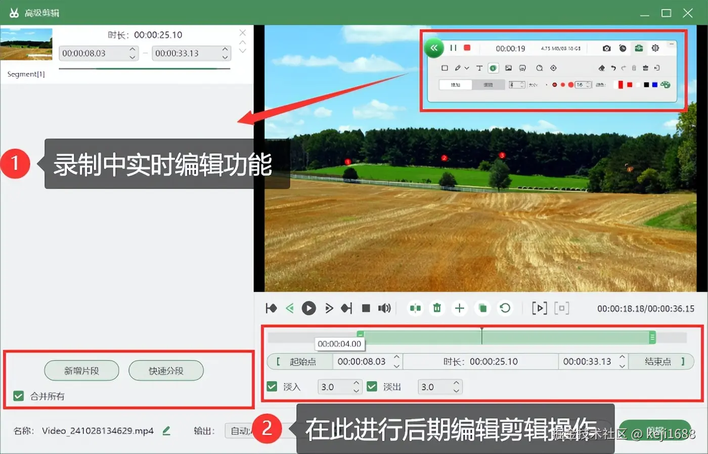 步骤3:设置好录制参数后,使用快捷键进行快速录屏。录制的过程中可以对视频进行编辑,录制完成后也可以进入【高级剪辑】中对视频进行后期剪辑处理。