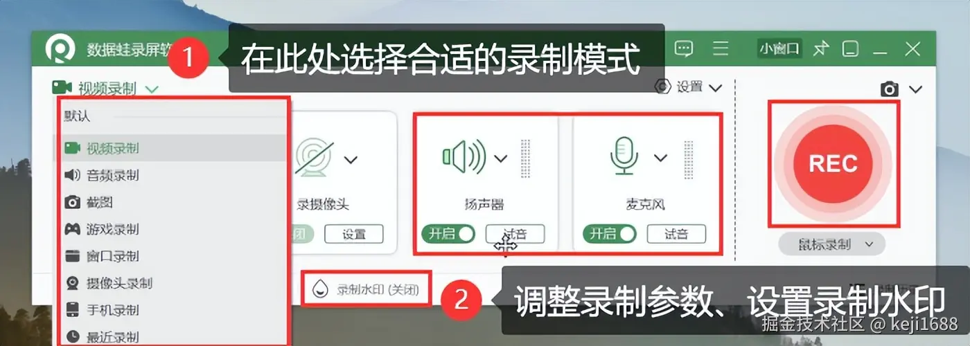 步骤2:在软件的首页中选择合适的录制模式,并自由调整录制参数。同时,软件支持无水印或者自定义水印录制,可进入【录制水印】自由设置,让您的视频更有个性化。