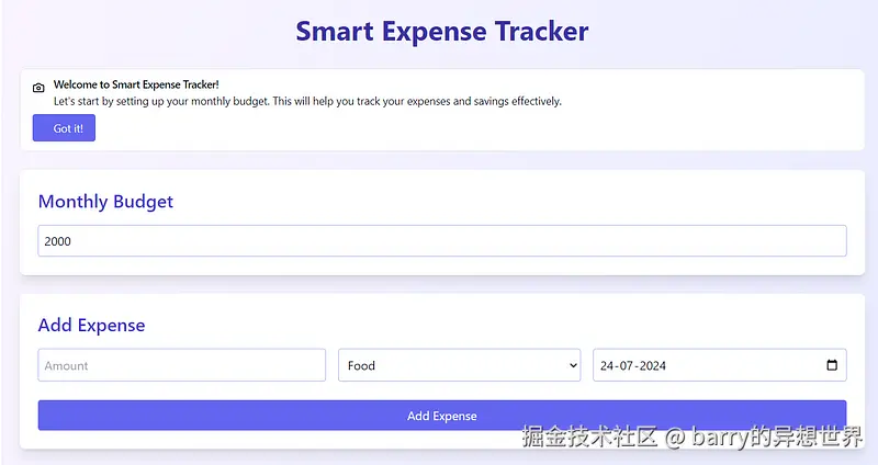 提示- 创建一个费用跟踪的网络应用,具备以下功能:首先,询问他们的月支出——比如说 2000 卢比。现在,无论这个人花费什么,请确保创建一些类别,如食品、旅行和必需品,并提供添加任何内容的选项。在月末添加一个节省资金的选项。此外,它还有投资选项,现在你知道是什么类型的。例如,“如果你每月在共同基金中投资 200,五年后你将拥有 X 金额。”此外,该应用还有生成与支出相关的图表和图形的功能。确保该应用的 UI/UX 设计视觉上吸引人。