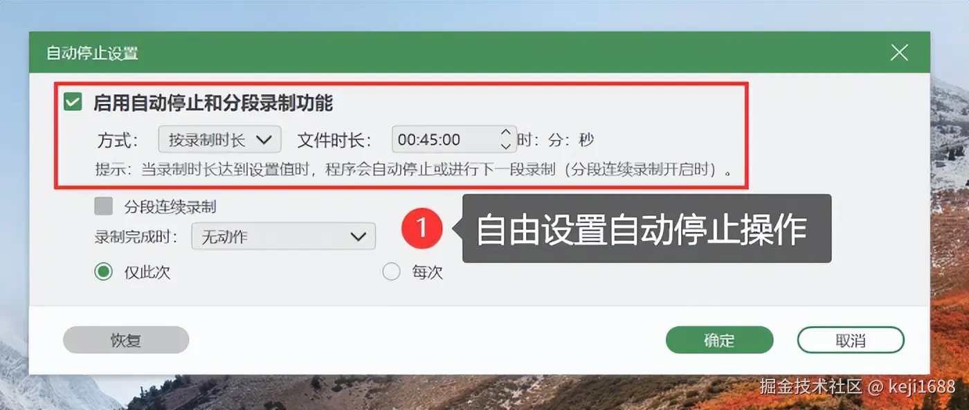 步骤2:软件还支持 【自动停止】 设置,可根据录制的内容自由设置好录制时间,软件将自动停止录制。