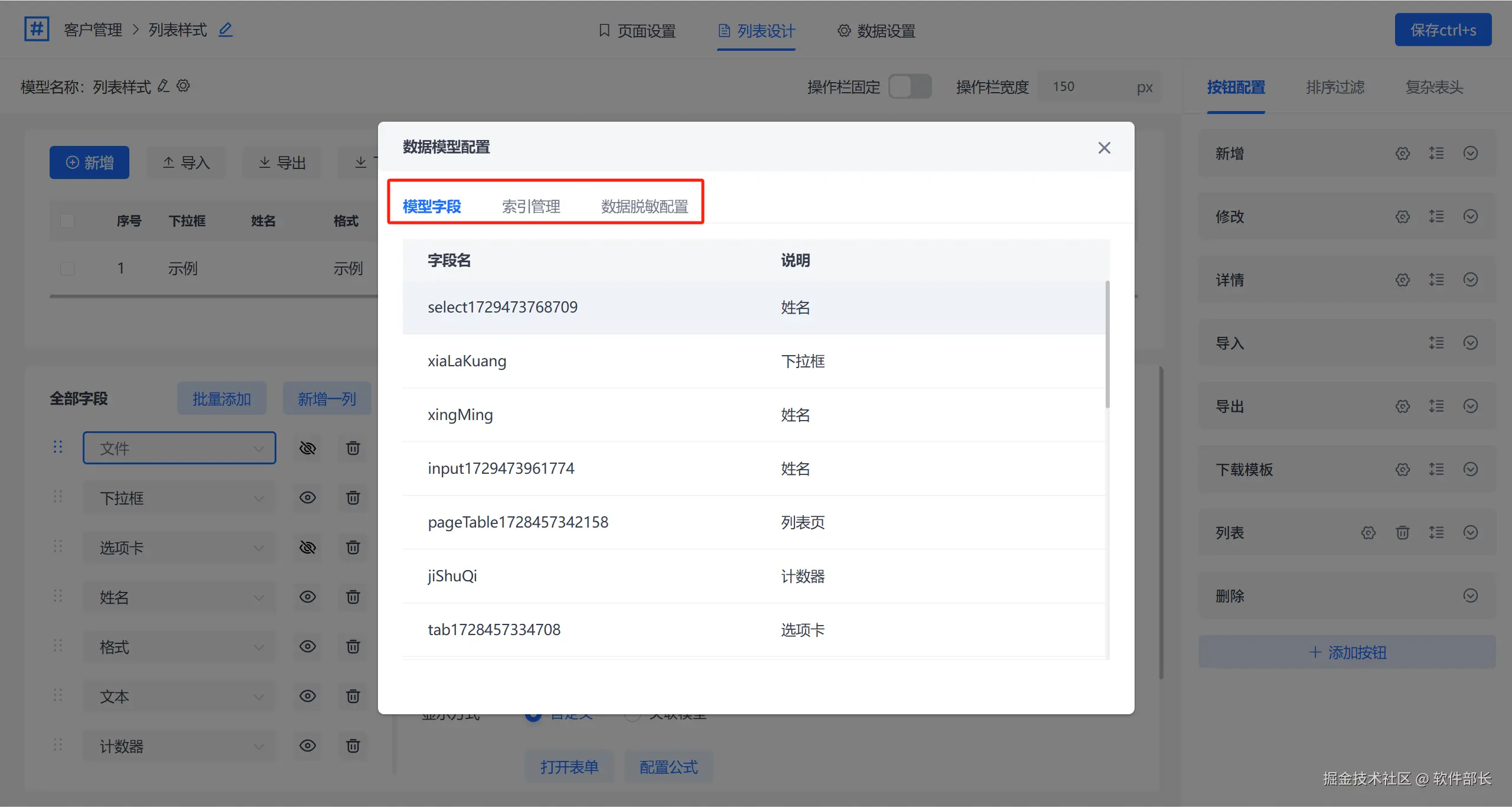 可以看到进入模型详情的设置页面,分别有模型字段管理、索引管理和数据脱敏配置,如下图所示: