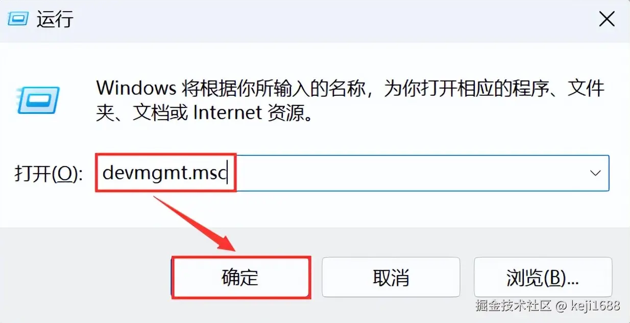 步骤1:按下 【Win+R】 打开 【运行】 窗口,输入 【devmgmt.msc】 并按回车键启动设备管理器。