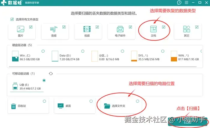 第1步: 在电脑中打开软件,主页上方选择需要恢复的数据类型,中下方选择需要扫描的电脑位置,最后点击【扫描】 ;