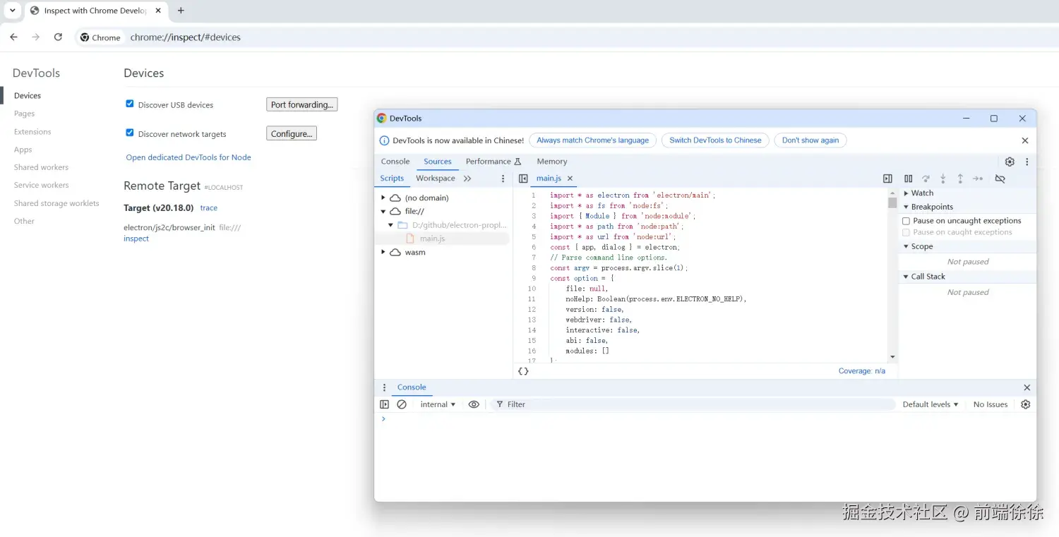 chrome://inspect/#devices,点击 "Open dedicated DevTools for Node"。这样就可以打开 Chrome DevTools 并连接到 Electron 主进程进行调试。