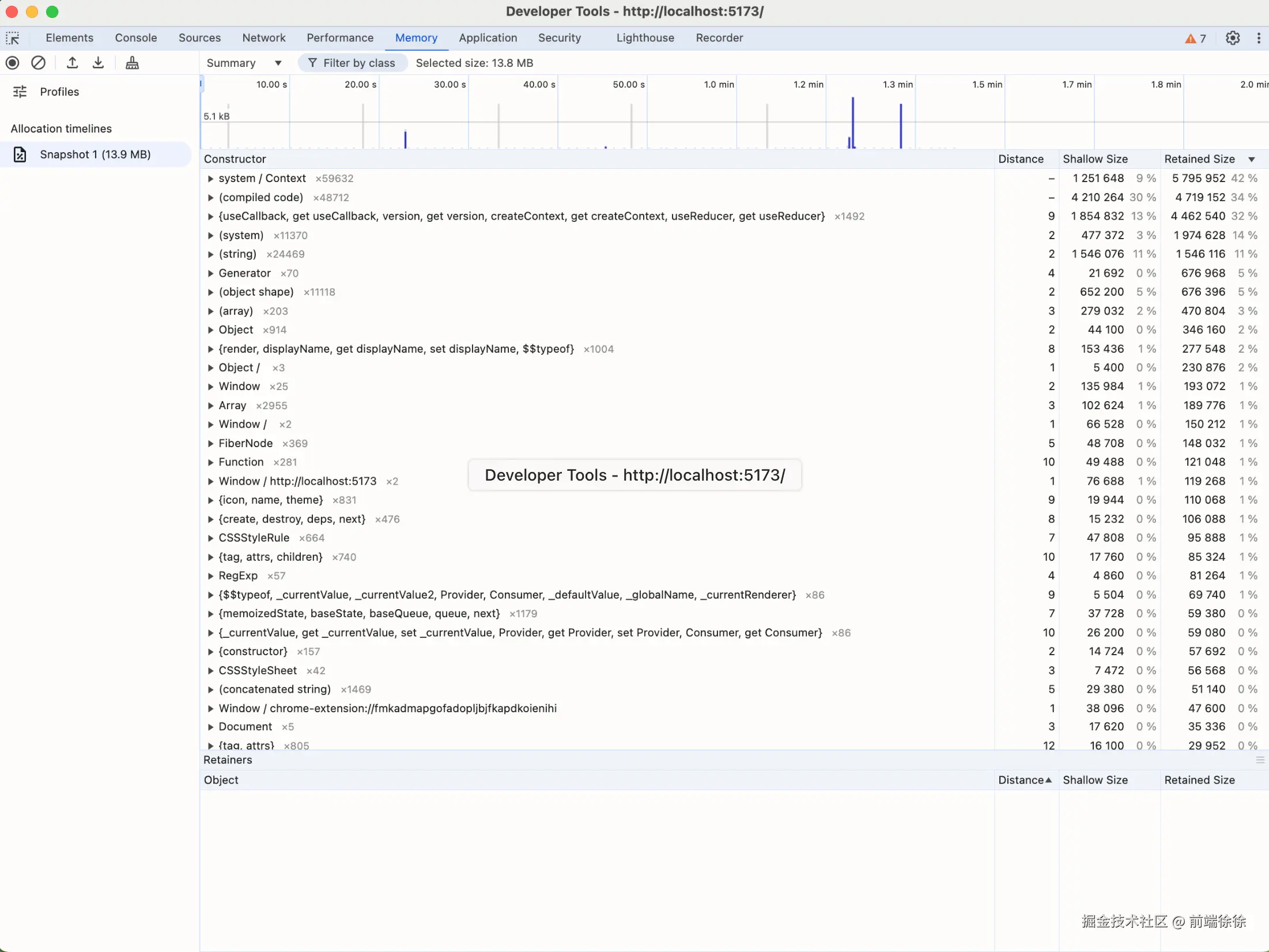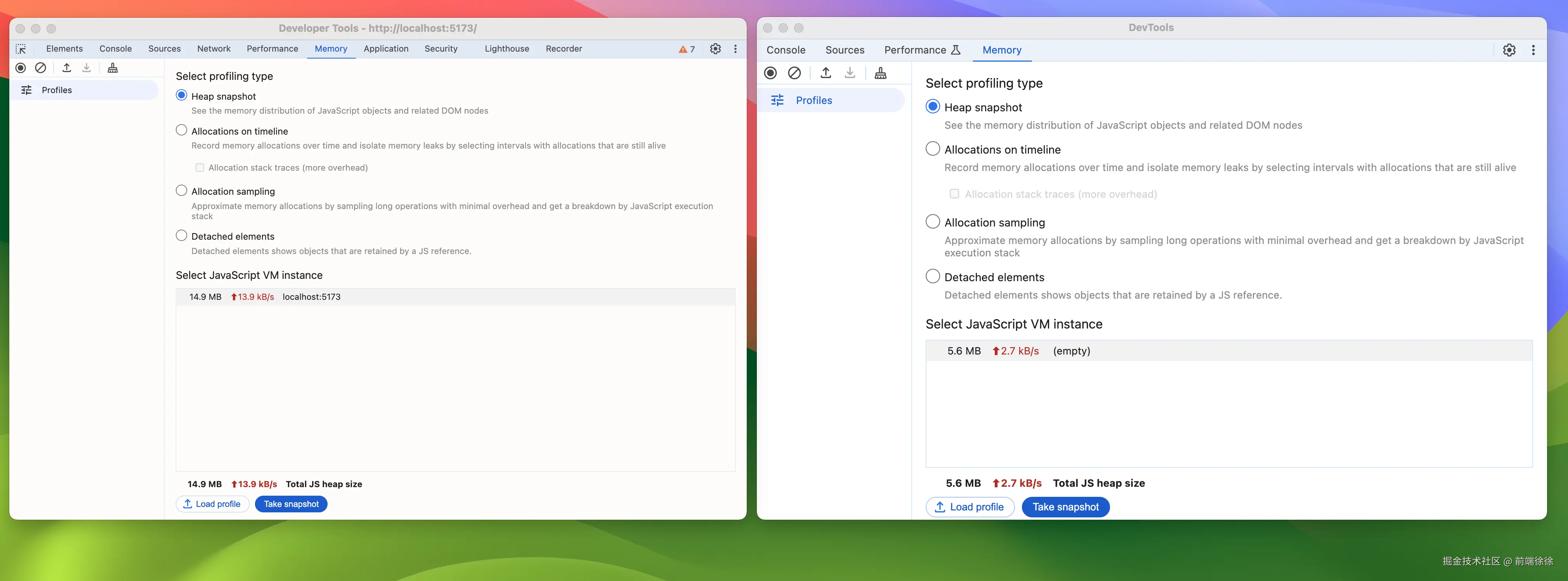 在 Electorn 的调试面板中,不管是渲染进程还是通过主进程都有 Memory 面板。下面左侧是渲染进程的 Memory 调试面板,右侧是通过 --inspect 后在 Chrome 另外派生出来的主进程的 Memory 调试面板。有了这两个面板你就可以非常仔细的监控整个应用的内存消耗情况了。