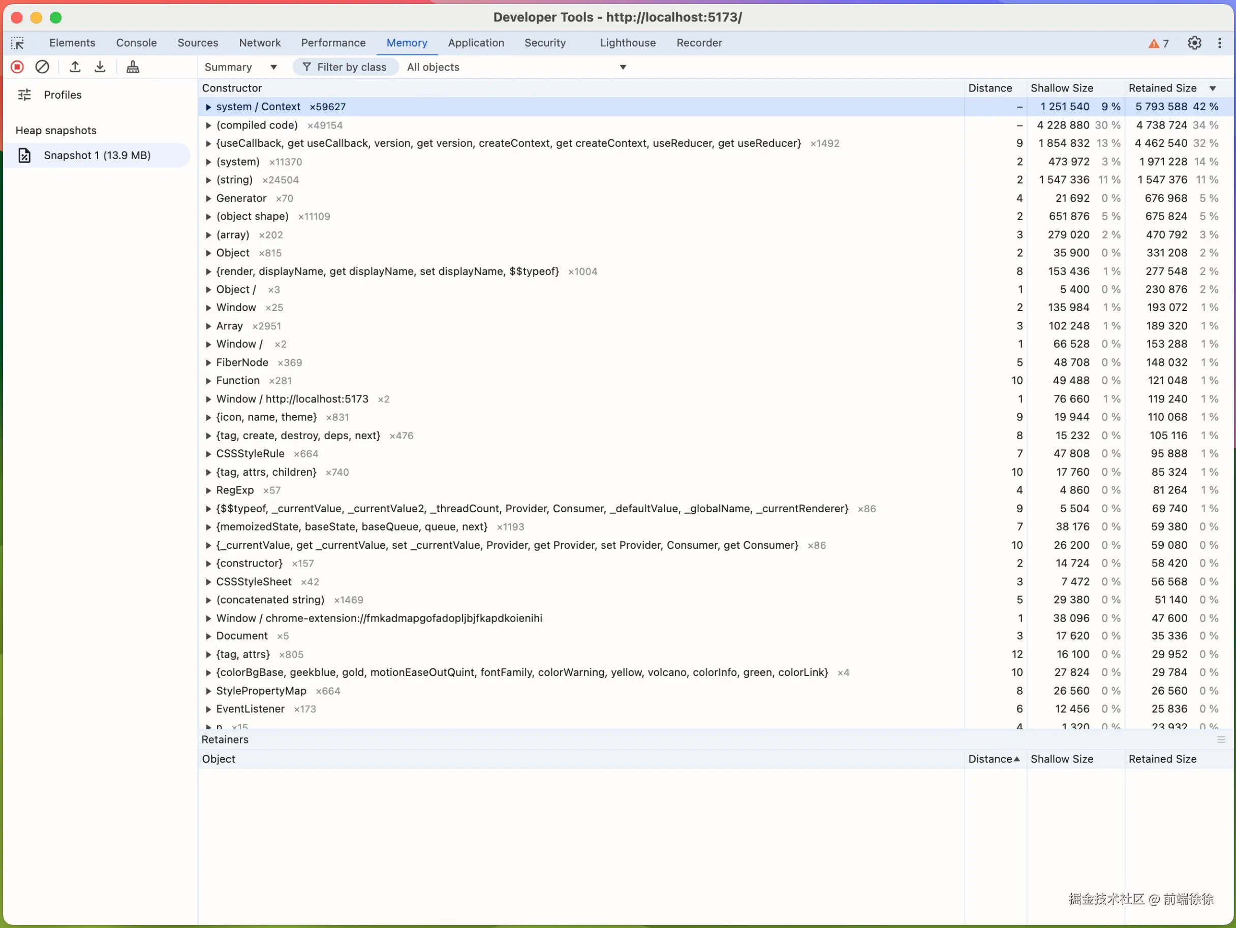 选择 Heap snapshot,并点击Take snapshot按钮,截取当前应用内存堆栈的快照信息,生成的快照信息可以通过三个维度查看。