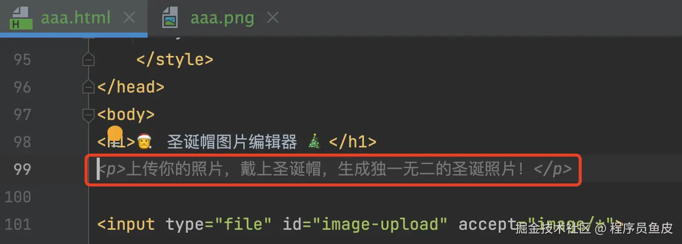 我们复制代码到一个新的 HTML 文件中,然后需要修改一下圣诞帽图片的地址为自己本地找的图片,因为 AI 并不知道你需要什么样的圣诞帽,网上找的图片也可能由于跨域或防盗链等原因无法正常加载。