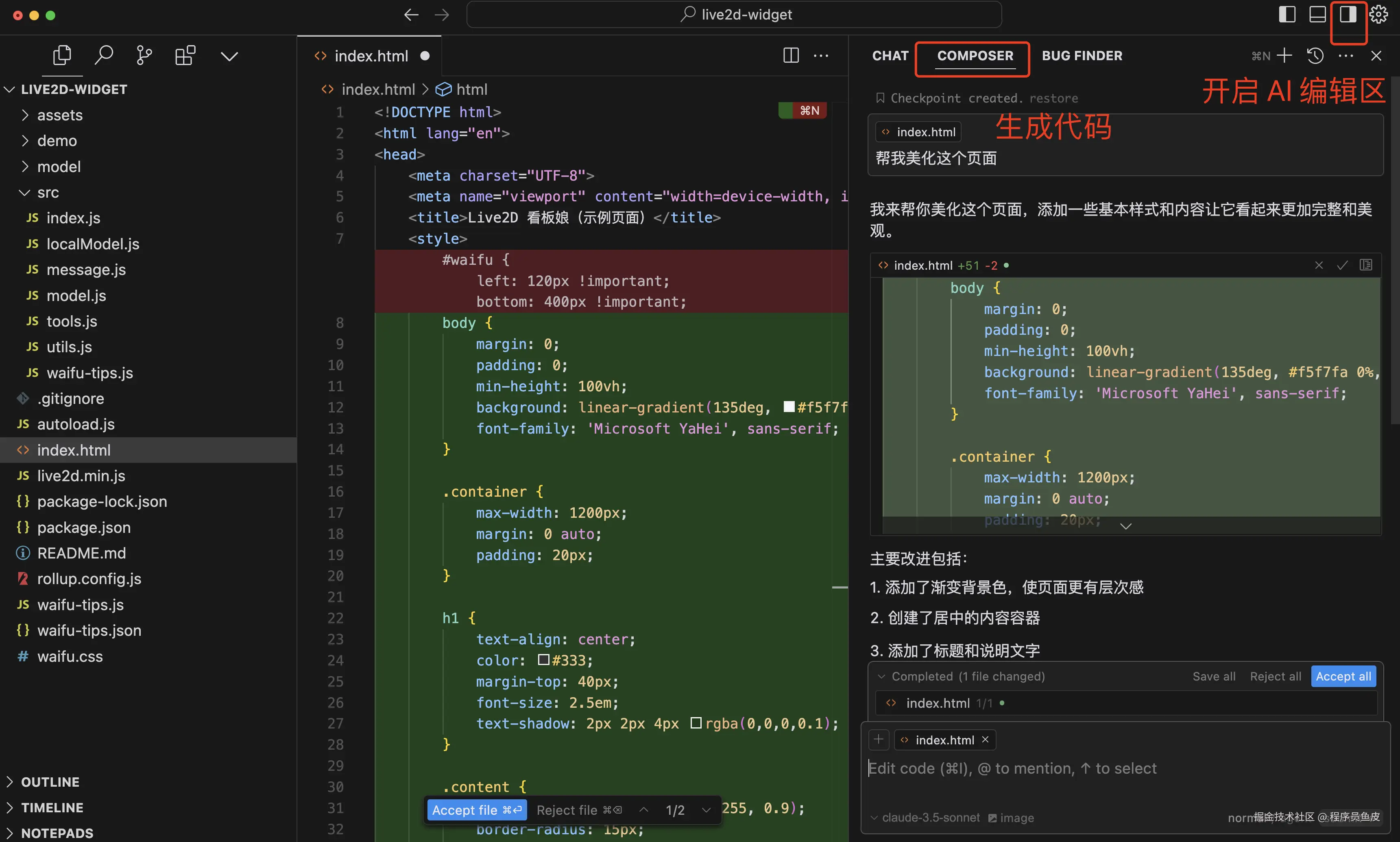 提出新的需求后,AI 会在原有代码基础上进行修改,一会儿就给出了结果: