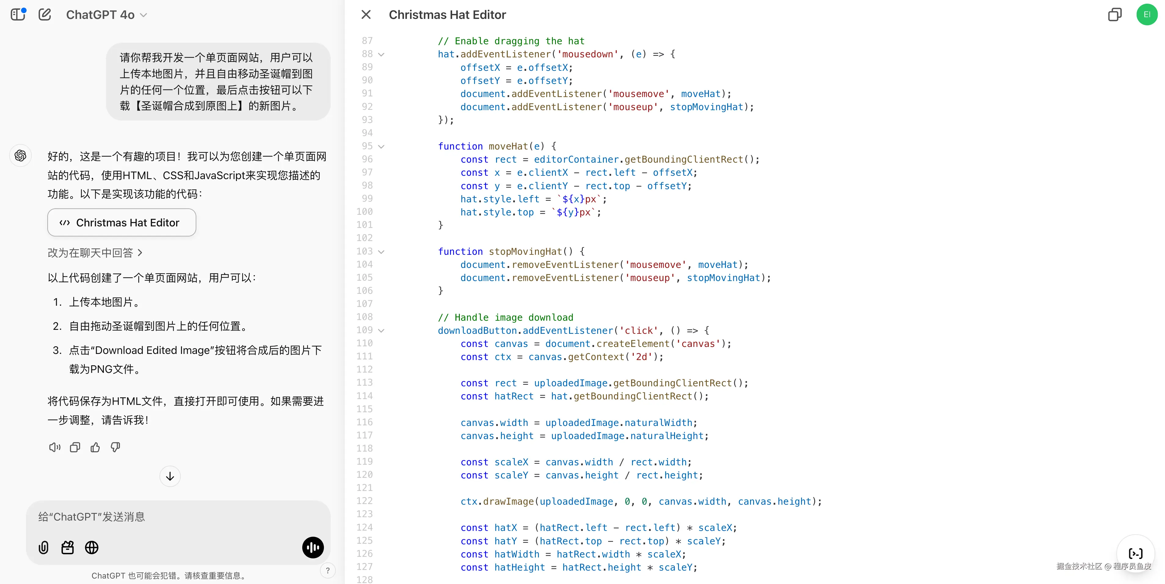 AI 的回复如下,生成了一堆代码。现在 GPT 对交互做了升级,生成代码时会自动给你打开一个编辑器界面: