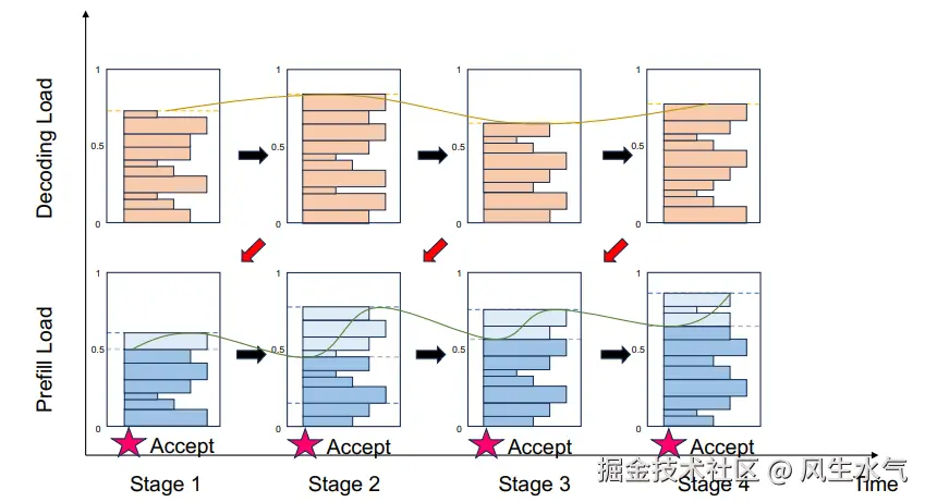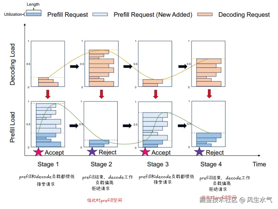如果请求超过了服务的能力,那么服务会处于过载状态,进而导致服务的SLO下降。在这里最简单的策略是直接丢弃。最简单的策略是Early Rejection:Conductor会基于prefill pool和 decode pool较大的那个负载来决定是否丢弃当前请求。这种方式通过拒绝请求的方式减少了无用计算,增强了负载均衡能力。但直接这样应用会带来一个负载波动问题。这种负载波动问题的根源在于预测解码负载与实际执行之间的时间差。示例如下: