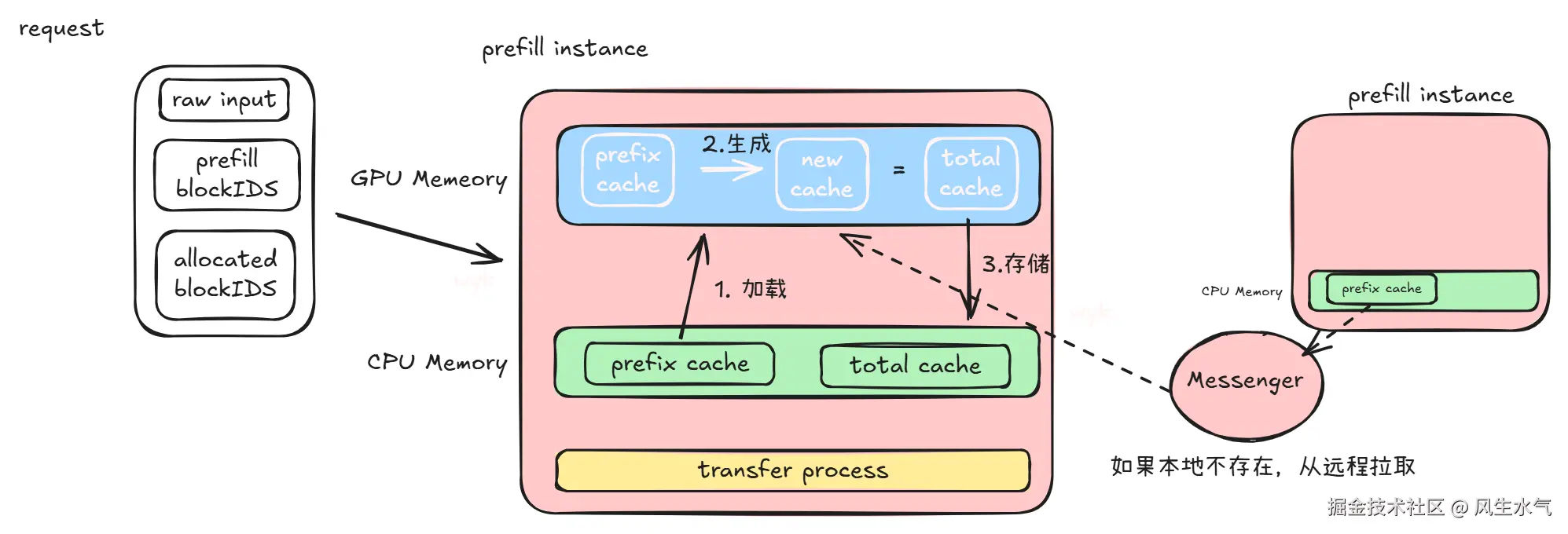 - 请求被分发到指定的prefill实例上进行全量的KVCache的计算。