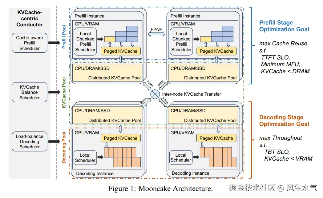 Mooncake是Kimi为了解决上述问题而提出的服务后端架构。它是一个以KVCache为中心的解聚合架构。优化思路:将处理流程分为prefill阶段和decode阶段。不同阶段的资源使用和优化目标不同。prefill阶段主要进行KVCache的计算,主要优化TTFT; decode阶段主要进行后续token的生成,主要优化TBT。 它的架构整体如下: