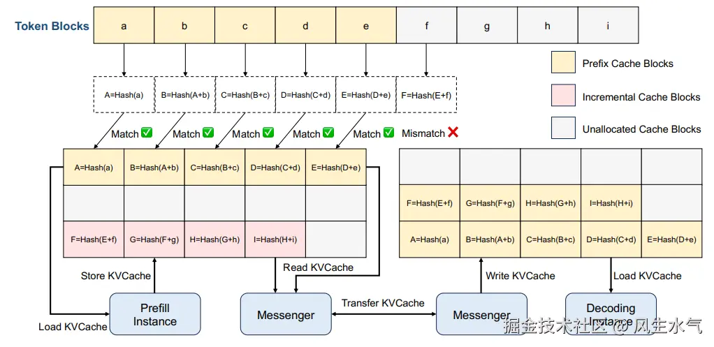 KVCache的Block被存储在CPU中的pool里面。当需要在GPU中使用到KVCache或者需要将KVCache传送到远程节点时,使用一个基于RDMA的组件Messenger来完成。这里的hash是基于之前块的hash结果和当前块的内容,这样做的目的是为了防止重复。