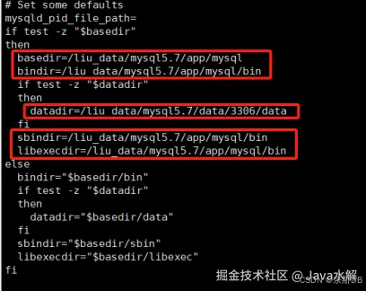 [root@ha1 ~]# cd /liu_data/mysql5.7/app/mysql/support-files/ ###MySQL的目录,这里以实际安装的目录为准哦 [root@ha1 support-files]# cp mysql.server mysql.server.bk [root@ha1 support-files]# vi mysql.server ###作用就是为了方便启动和关闭mysql服务,这个脚本中调用mysqld_safe来启动mysqld。以下是mysql.server需要修改的内容**修改一: **目录和数据存储目录