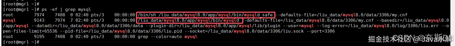 [root@mgr1 ~]# nohup /liu_data/mysql8.0/app/mysql/bin/mysqld --defaults-file=/liu_data/mysql8.0/data/3306/my.cnf --user=mysql & ###mysqld数据库后台进程,只是显示了指定的参数,为了方便管理使用mysqld_safe或者指定多个参数 [root@mgr1 ~]# ps -ef | grep mysql