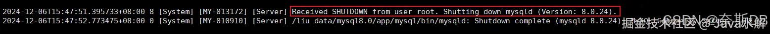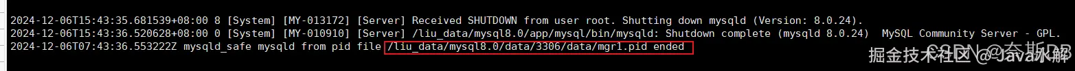 [root@mgr1 3306]# mysql -uroot -p123456 -S /liu_data/mysql8.0/data/3306/liu.sock mysql> shutdown; [root@mgr1 ~]# tail -200f /liu_data/mysql8.0/log/3306/liu.err ###查看错误文件,观察关闭信息