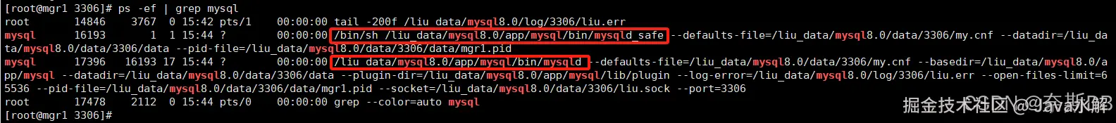 [root@mgr1 ~]# nohup /liu_data/mysql8.0/app/mysql/bin/mysqld_safe --defaults-file=/liu_data/mysql8.0/data/3306/my.cnf & ###mysqld_safe带动mysqld数据库后台进程 [root@mgr1 ~]# ps -ef | grep mysql