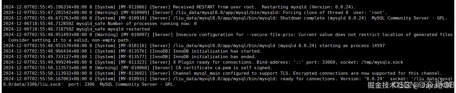 [root@mgr1 3306]# mysql -uroot -p123456 -S /liu_data/mysql8.0/data/3306/liu.sock mysql> restart; [root@mgr1 ~]# tail -200f /liu_data/mysql8.0/log/3306/liu.err ###查看错误文件,观察重启信息
