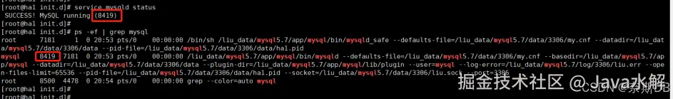 [root@ha1 support-files]# cp /liu_data/mysql5.7/app/mysql/support-files/mysql.server /etc/init.d/mysqld ###将启动脚本放到系统服务管理中并命名为mysqld [root@ha1 ~]# chmod 755 /etc/init.d/mysqld [root@ha1 ~]# chkconfig --add mysqld ###将mysqld加入到服务中 [root@ha1 init.d]# service mysqld start [root@ha1 init.d]# chkconfig mysqld on ###开机启动mysqld服务 [root@ha1 init.d]# service mysqld statusservice mysqld status查询服务的PID,并且通过ps -ef | grep mysql查看MySQL数据库的PID是否一致
