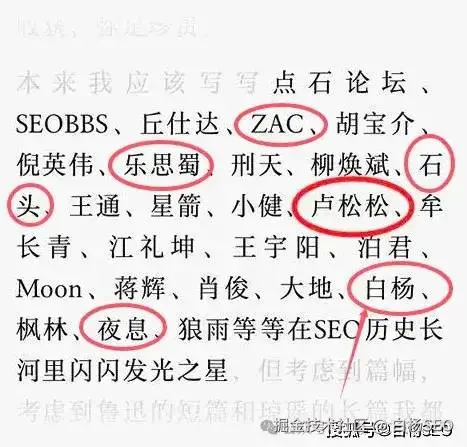 2024年12月20日补:上面文中提到的我们那些SEO界大咖名字,比如夫唯老师,他就是曾经鼓励我坚持分享SEO的一位大佬之一。经过这六七年公众号分享,如果算上2012年用杨红林博客开始,终于也能跟他们名字放在一起了。