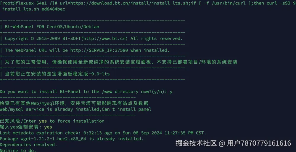 接下来安装我们的服务器搭子宝塔面板 ,下面是宝塔官方给出的服务器通用宝塔面板安装命令,直接复制到终端并回车安装即可