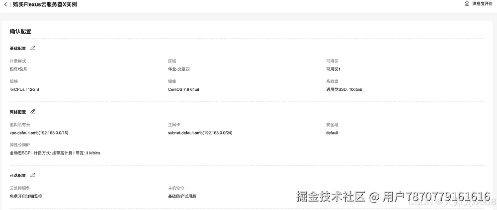 首先,来到华为云首页,我们可以看到华为云Flexus云服务的海报,点击了解详情,即可进入 Flexus 云服务产品介绍页。或者点击传送门,直接进入Flexus X云服务器X实例的选购页面。点击购买,进入选择配置页面。