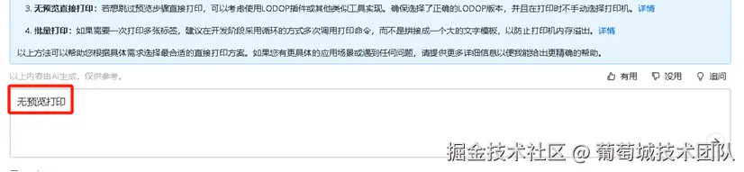 得到以下答案,虽然没有满意的,但是这里有个“无预览打印”更贴合我的检索目的,于是我在智能回答的右下角点击“追问”。