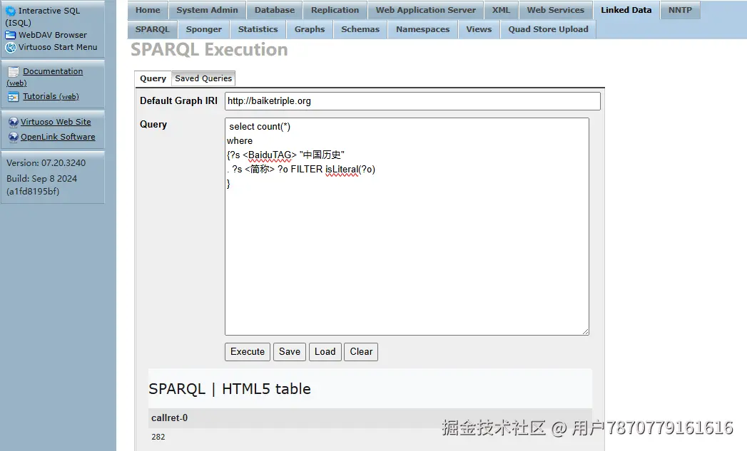 导入6500万条RDF数据的整个过程耗时约254秒,平均每秒钟处理约25.59万条三元组数据。在几年之前,同样是导入这组数据,花的时间是大约6个小时,时间节约了近100倍,这得益于Virtuoso高效的批量导入机制以及华为云X实例的优秀I/O性能,数据导入的总体表现令人满意。