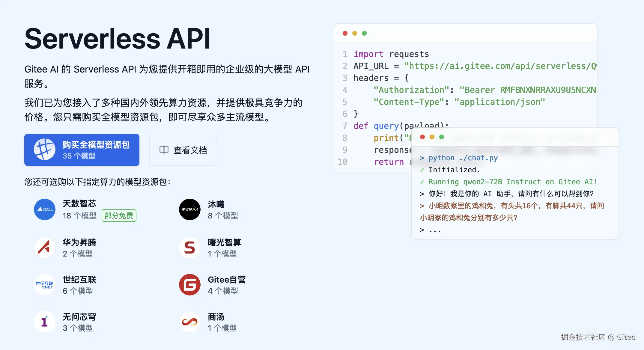 Serverless API 还提供了文本生成、语音识别、语音生成、向量与重排模型、代码生成等多种类型下的多个大模型的 API 使用。同时,Gitee AI 也上线了模型资源包,通过极低的价格即可尽享众多主流模型。