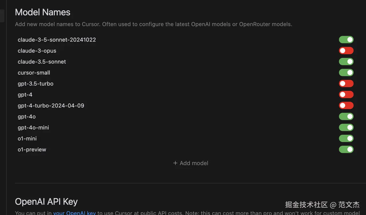 在交互之外,Cursor 并没有过多投入精力开发自己的大模型(算是一种克制),而是提供了比较流程的模型切换功能,用户可以在配置面板上按自己的意愿在各种上下文中切换主流 LLM: