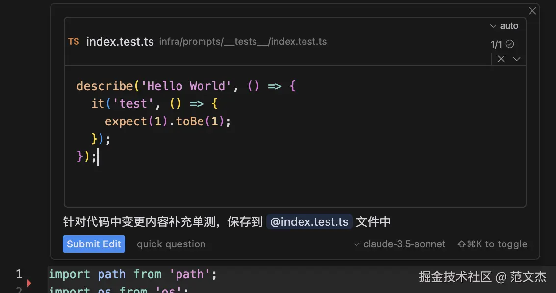 举个具体例子,我在使用 GPT 等工具生成单测时,由于缺少 Vitest 相关语料,无论怎么调整 Prompt,大多数时候都会返回基于 Jest 的测试代码,而我更喜欢用 Vitest,所以每次都需要把代码复制出来,一通调整后才能放入仓库内运行;而在使用 Cursor 时,只要使用适当的 Prompt,多数时候都能返回基于 Vitest 的结果,调整成本要小的多,例如我常用的 Prompt: