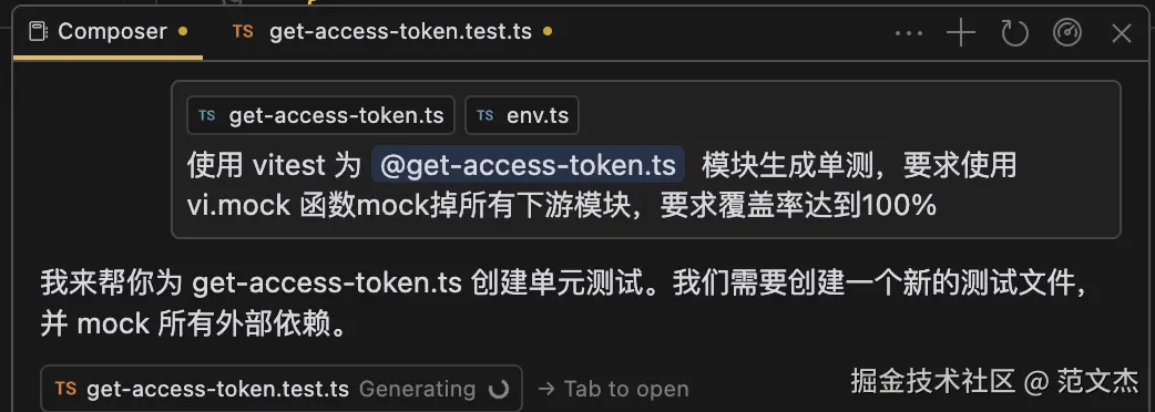 而使用 Cursor 后,问题被优化了许多,我们可以使用 Cursor 专门针对变更内容生成单测,例如下面的 Prompt:
