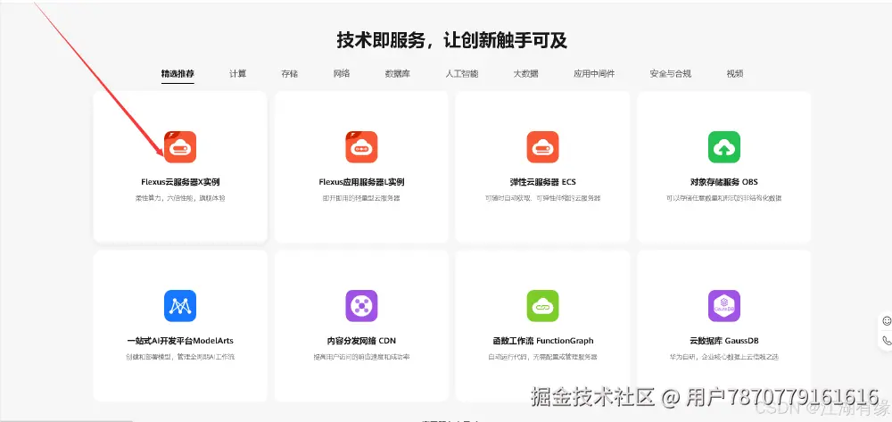 我们在华为云官网首页,精选推荐模块中,可以看到Flexus云服务器X实例,点击进入Flexus云服务器X实例主页。
