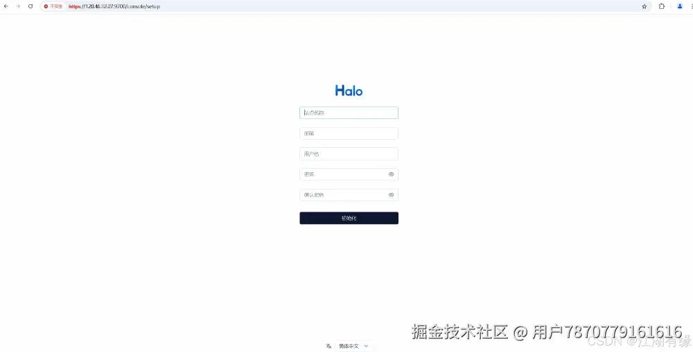 []()浏览器访问地址:https://弹性公网IP地址:9700,将IP替换为自己服务器IP地址。浏览器打开后,进入Halo初始页。