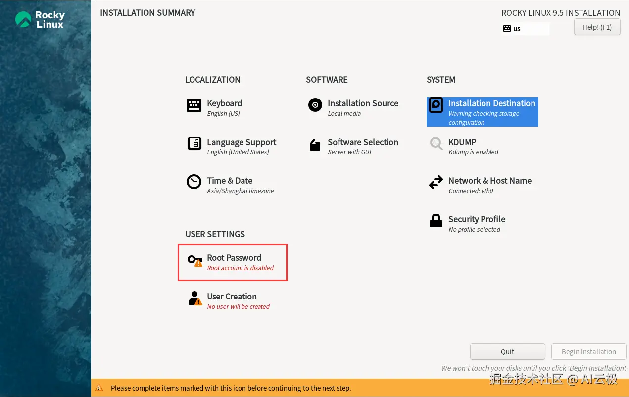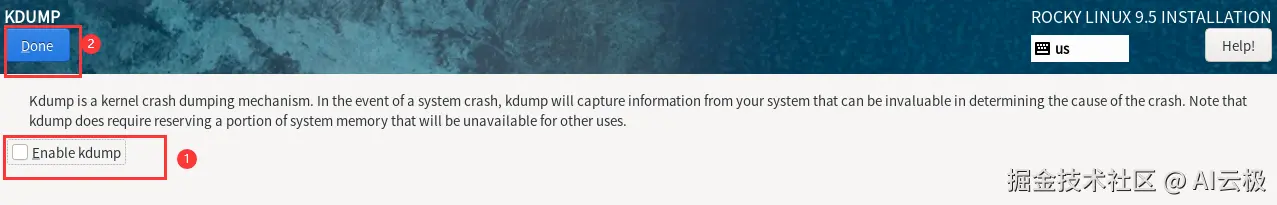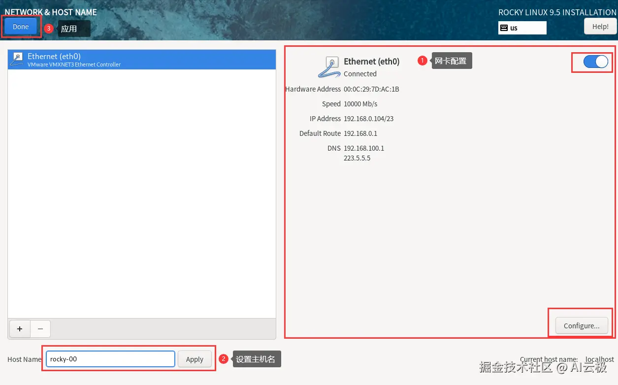 选择网络和主机名(Network & Host Name),开启网卡,设置主机名:rocky-00,点击应用(apply),点击执行(Done)