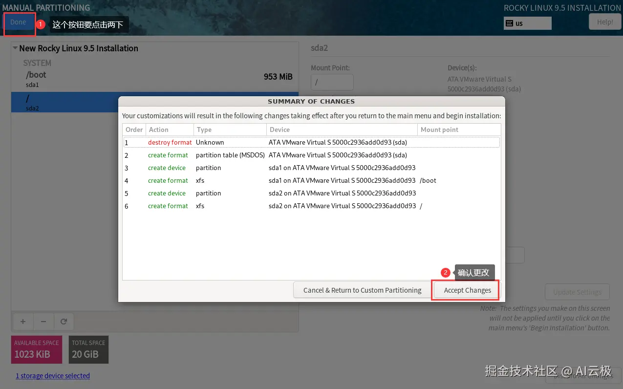 选择接受更改(Accept Changes)按钮将更改写入磁盘,同时返回安装界面