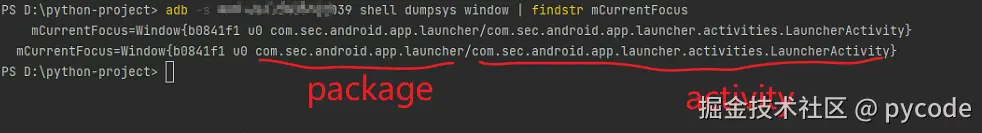 adb -s 你的设备ID shell dumpsys window | findstr mCurrentFocus