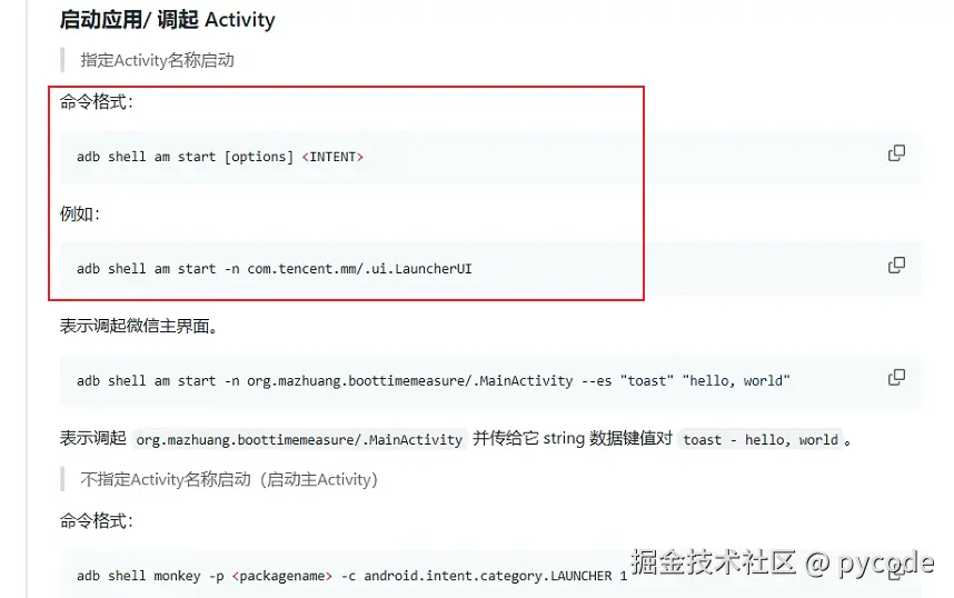 1. 分析 start_app函数源码:如果提供了 `activity` 参数,`start_app` 会使用 `adb shell am start` 命令启动特定的 Activity: def start_app(self, package, activity=None):