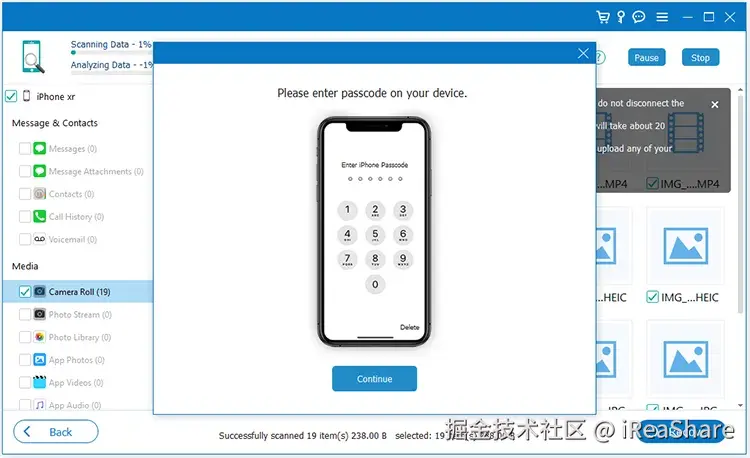 步骤 4: 在 iPhone 或 iPad 上输入密码,然后在 PC 上单击“继续”。然后软件将扫描您的 iOS 数据。