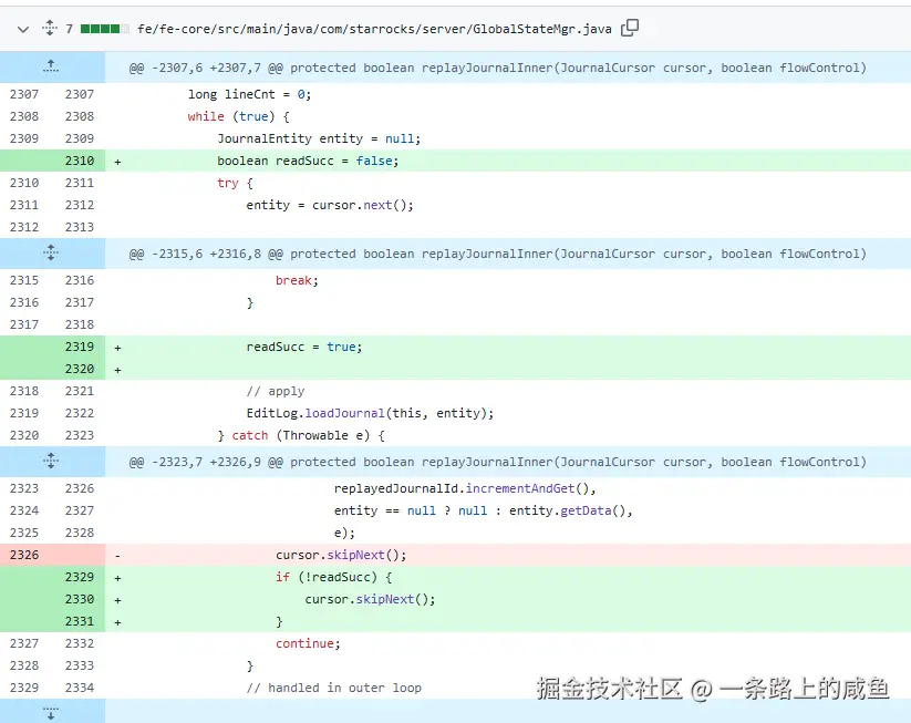 然后遇事不决翻源码,查看最近和Checkpoint相关的代码不是是否出现了变更,跟踪相关部分的源码发现在GlobalStateMgr.java(fe/fe-core/src/main/java/com/starrocks/server/GlobalStateMgr.java)类中的replayJournalInner方法,最近进行了一次bugfix,查看这次bugfix的问题。