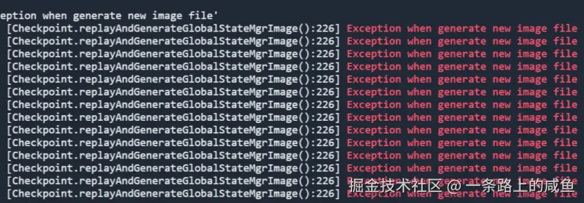 由以上日志再配合源码,可以发现其触发了Checkpoint操作,但是Checkpoint过程中出现了异常,导致CheckPoint过程失败,也就造成了整个image一直没有更新。继而继续查询日志,找失败的原因,在该日志信息的后面可以看到其报错信息,其信息如下: