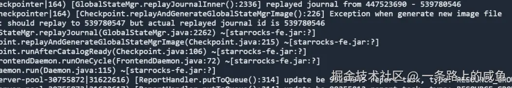 于是准备在日志中找相关的佐证。于是开始查询查看源码,查看进行Checkpoint操作的类Checkpoint.java(路径:fe/fe-core/src/main/java/com/starrocks/leader/Checkpoint.java),从下面的源码中可以看出,在replayAndGenerateGlobalStateMgrImage方法中,可以看到进行Checkpoint操作时其打印了相关日志,于是在fe的相关日志中查询是否输出了这些日志信息,根据其是否出现,可以判定是否做了Checkpoint操作,并且Checkpoint操作是否成功。
