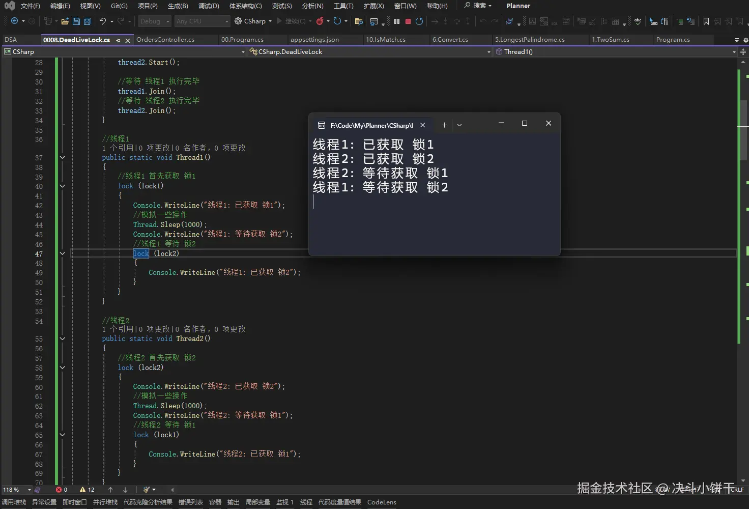 可以发现线程1和线程2都在等待彼此所拥有的锁。