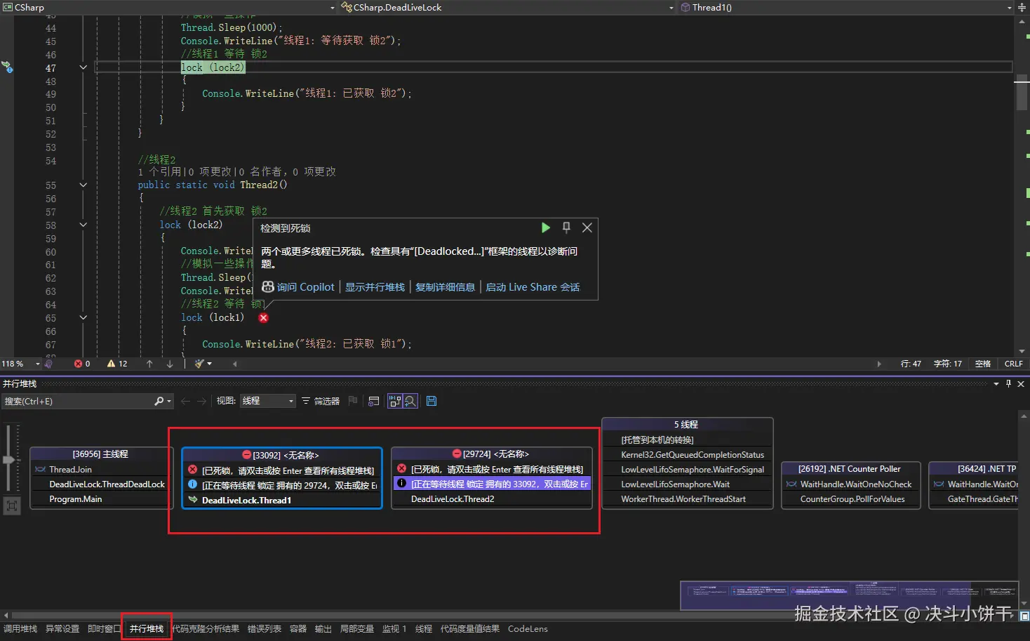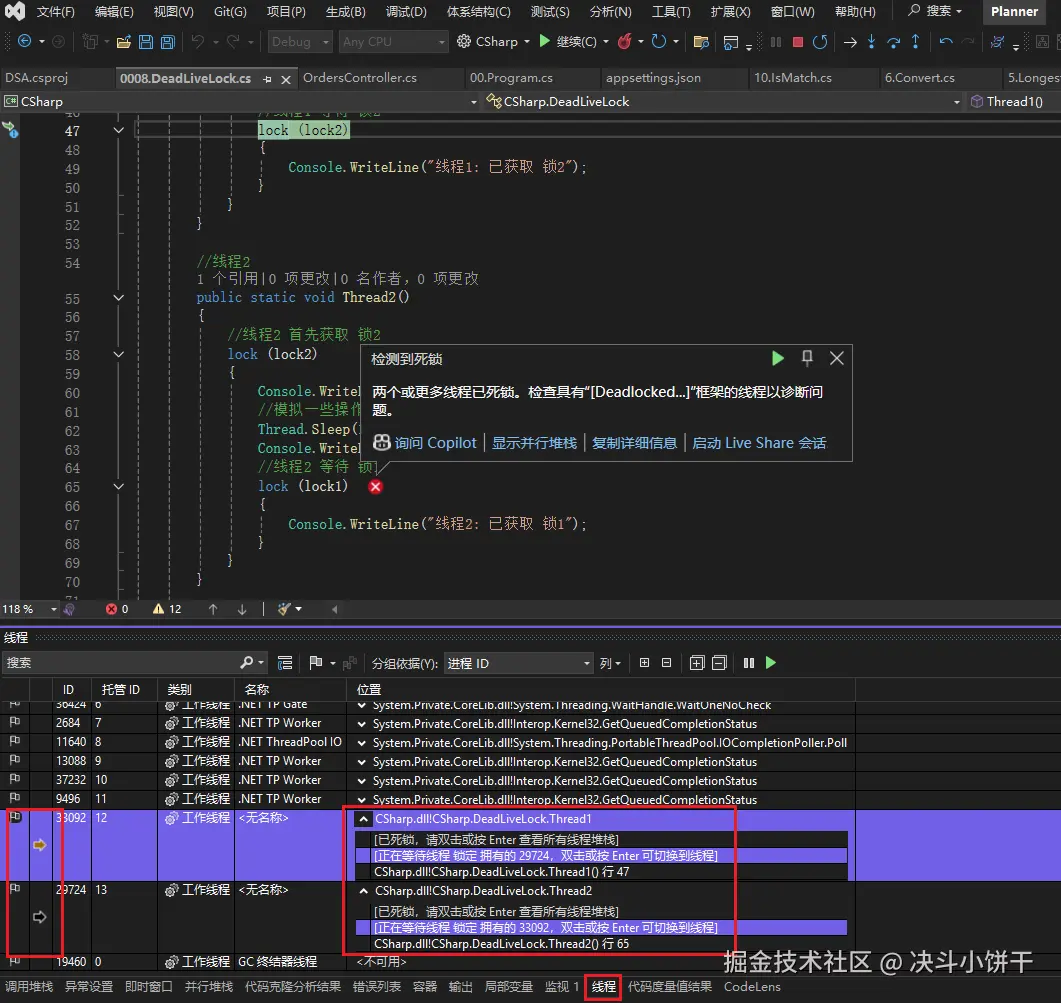 可以看到已经提示检测到死锁了,同时在调用堆栈窗口中还可以通过双击切换具体发生死锁的代码。