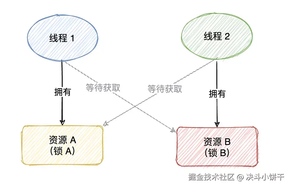 线程死锁通常是因为两个或两个以上线程在资源争夺中,形成循环等待,导致它们都无法继续执行各自后续操作的现象。