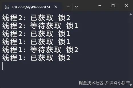 Console.WriteLine("线程2: 已获取 锁1");