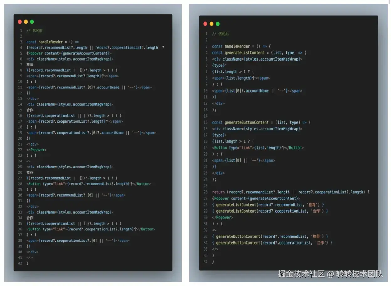 - 注意将组件的逻辑部分与 UI 部分分离,形成容器组件和展示组件:容器组件负责管理状态和逻辑,展示组件只关注 UI 渲染,简化组件结构。
