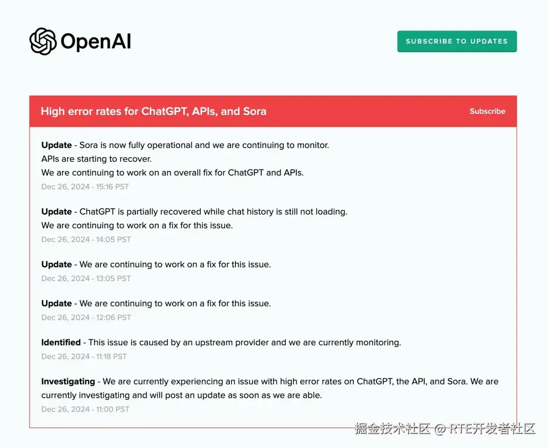 今天凌晨,据网友和媒体发现,OpenAI 的 AI 服务器发生故障,本次系统服务中断于北京时间 12 月 27 日凌晨 2 点 30 分左右开始,影响了 ChatGPT 聊天机器人、Sora 视频生成模型以及部分 API 调用。
