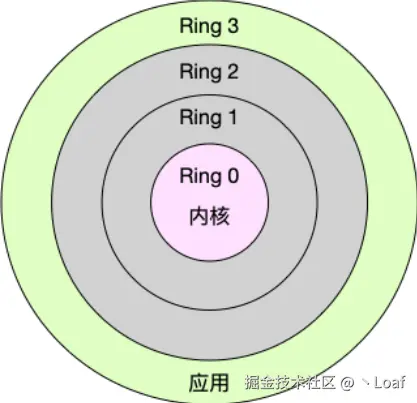 Ring 1( 设备驱动程序 )、Ring 2( 某些中间件层 )并不常用。看了一下资料,在Linux上并没有用到。