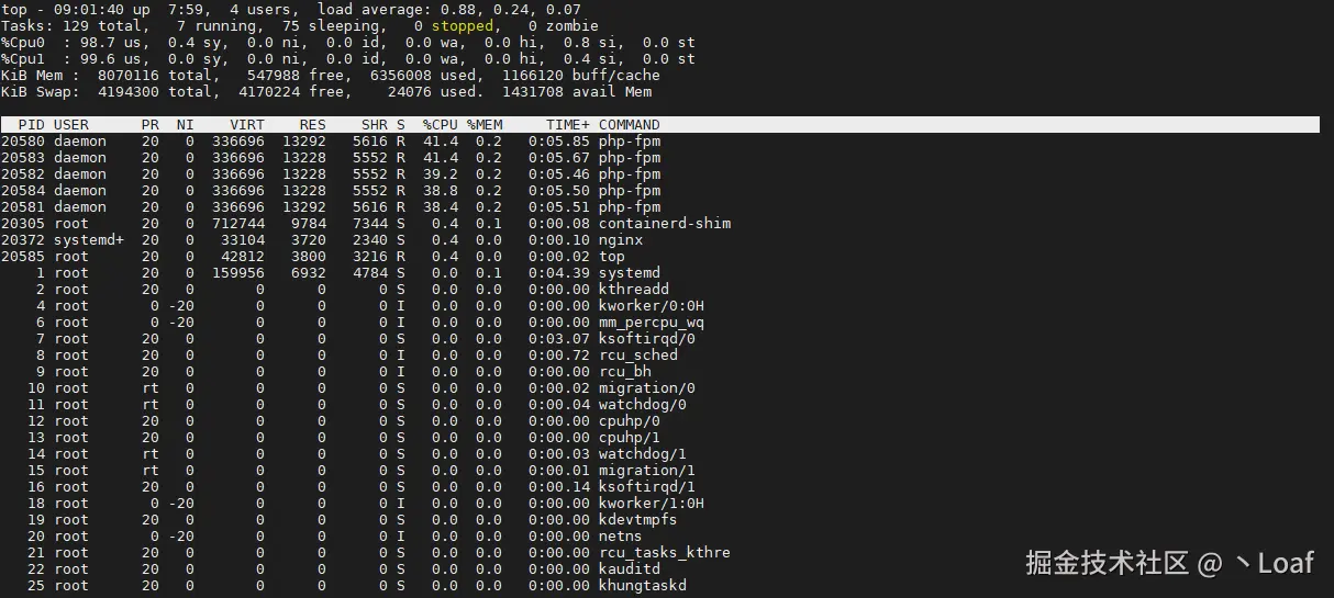 使用top、pidstat等工具查看各进程或线程的 CPU 占用情况: